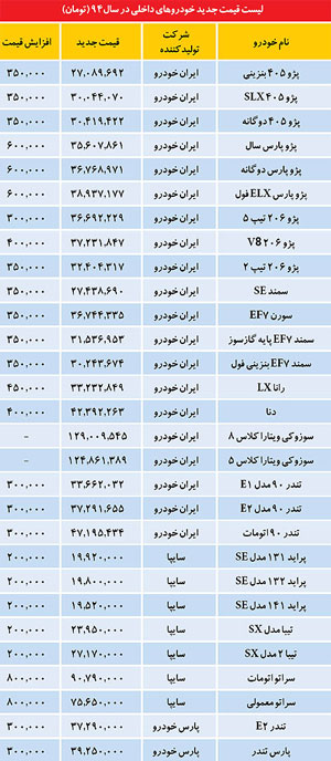 به گزارش روز نو، قیمت رسمی خودروهای 94 (+جدول)خودروسازان کشور در حالی قیمت محصولات خود را در سال 94 اعلام کردند که بر این اساس، حداقل 200 هزار تومان و حداکثر 800 هزار تومان به قیمت خودروهای داخلی اضافه شده است. آن طور که از نمایندگی‌های رسمی خودروسازان خبر می‌رسد، قیمت خودروهای داخلی از دیروز و متناسب با هزینه‌های دولتی شامل «مالیات بر ارزش افزوده»، «بیمه»، «شماره‌گذاری» و همچنین هزینه «خدمات پس از فروش» افزایش یافته است. این در شرایطی است که گفته می‌شود خودروسازان به‌زودی درخواست افزایش قیمتی دوباره را به شورای رقابت خواهند فرستاد.