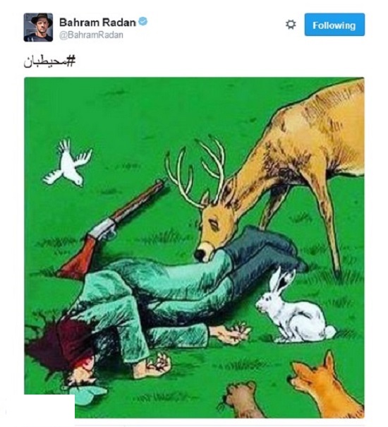 در یکی از همین واکنش‌ها بهرام رادان بازیگر فیلم‌های چون «آتش‌بس»، «سنتوری» و «گاوخونی» تصویری را با هشتگ محیط بان در توئیتر منتشر کرد.