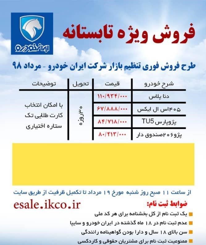 فروش فوری تنظیم بازار ویژه تابستانه  ایران خودرو از روز شنبه 19 مردادماه آغاز می شود.