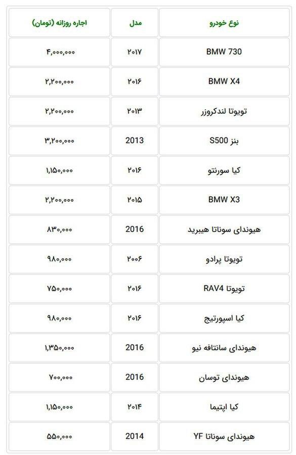 هزینه اجاره خودرو های مختلف در پایتخت + جدول