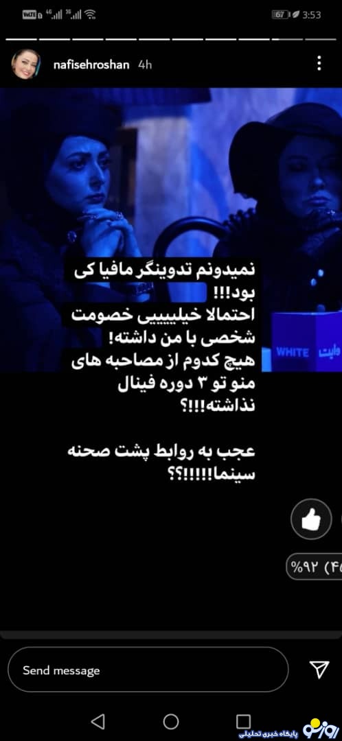 روزنو :نفیسه روشن که این روزها در شب های مافیا شرکت کرده است در استوری های اینستاگرامش دست به افشاگری زده است.