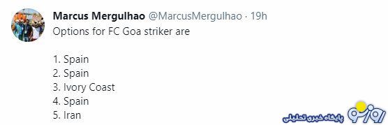 «مارکوس» دبیر روزنامه «تایمز آو ایندیا» اعلام کرد تیم فوتبال گوا هندوستان پنج گزینه برای خط حمله مدنظر دارد که یکی از این گزینه‌ها، مهاجم ایرانی است.