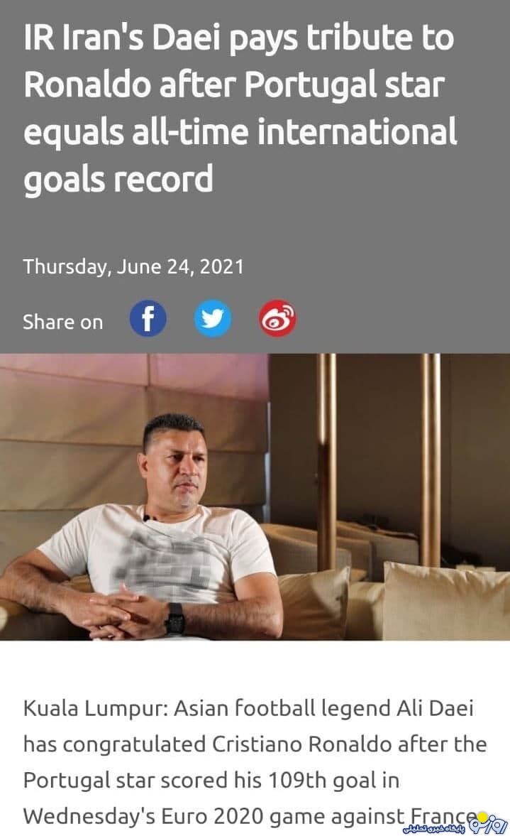 به گزارش روزنو، تبریک اینستاگرامی علی دایی به کریستیانو رونالدو به مناسب رسیدن به رکورد ۱۰۹ ملی او، در سایت کنفدراسیون فوتبال آسیا بازتاب داشت.