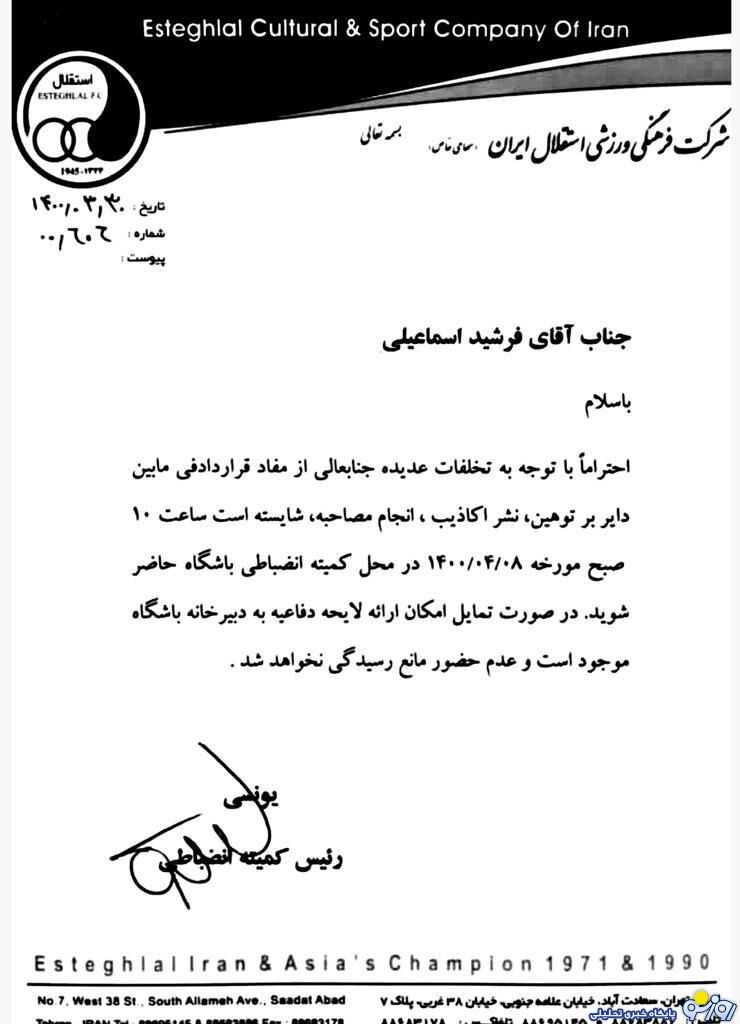 روزنو :با وجود تکذیب مدیرعامل استقلال اما نامه احضار بازیکن این تیم به کمیته انضباطی منتشر شده است.