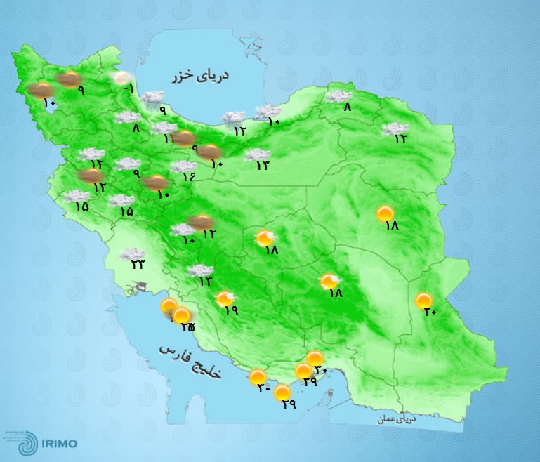 بر اساس تحلیل نقشه‌های همدیدی و آینده‌نگری سازمان هواشناسی امروز در شمال آذربایجان شرقی، اردبیل، سواحل دریای خزر، خراسان شمالی، خراسان رضوی، کرمانشاه، همدان، مرکزی، قم، اصفهان، چهارمحال و بختیاری، کهگیلویه و بویراحمد، لرستان و ایلام بارش باران، برف و وزش باد پیش بینی شده است.