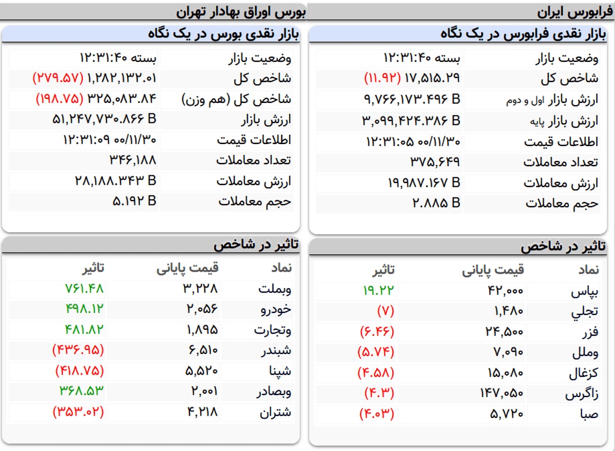 بر اساس این گزارش، در بازار‌های فرابورس ایران هم با معامله ۲ میلیارد و ۸۹۶ میلیون ورقه به‌ارزش ۲ هزار و ۱۹ میلیارد تومان در ۳۷۶ هزار نوبت، شاخص فرابورس (آیفکس) ۱۱ واحد افت کرد و در ارتفاع ۱۷ هزار و ۵۱۵ واحد قرار گرفت.