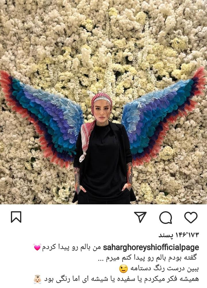 سحر قریشی در اینستاگرام عکس زیر را منتشر کرد و نوشت: من بالم رو پیدا کردم گفته بودم بالم رو پیدا کنم میرم ببین درست رنگ دستامه همیشه فکر میکردم یا سفیده یا شیشه ای اما رنگی بود