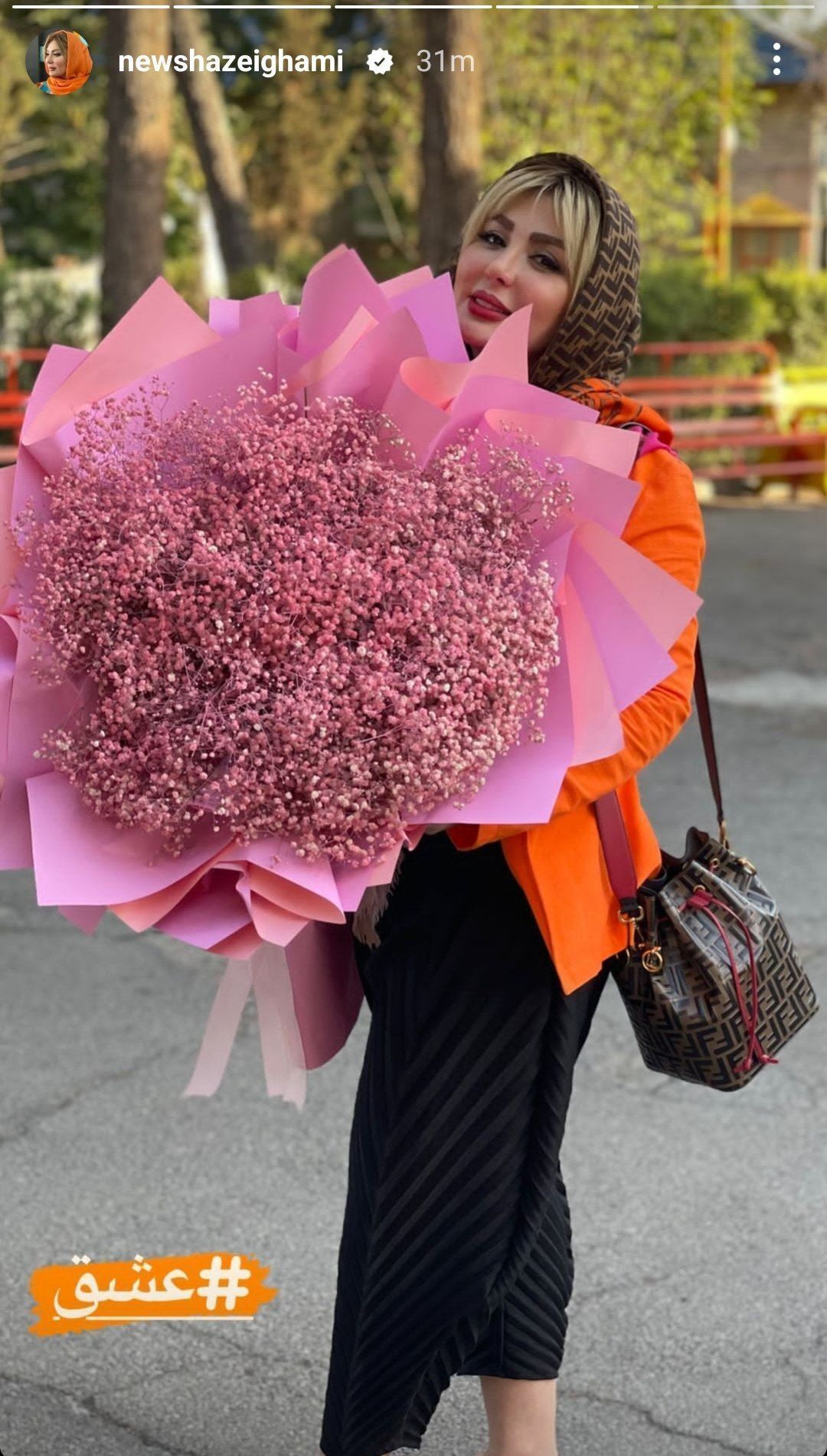 نیوشا ضیغمی دو استوری منتشر کرد که در اولی دسته گلی بزرگ و قیمتی را به دست گرفته و آن را با #عشق منتشر کرده است.