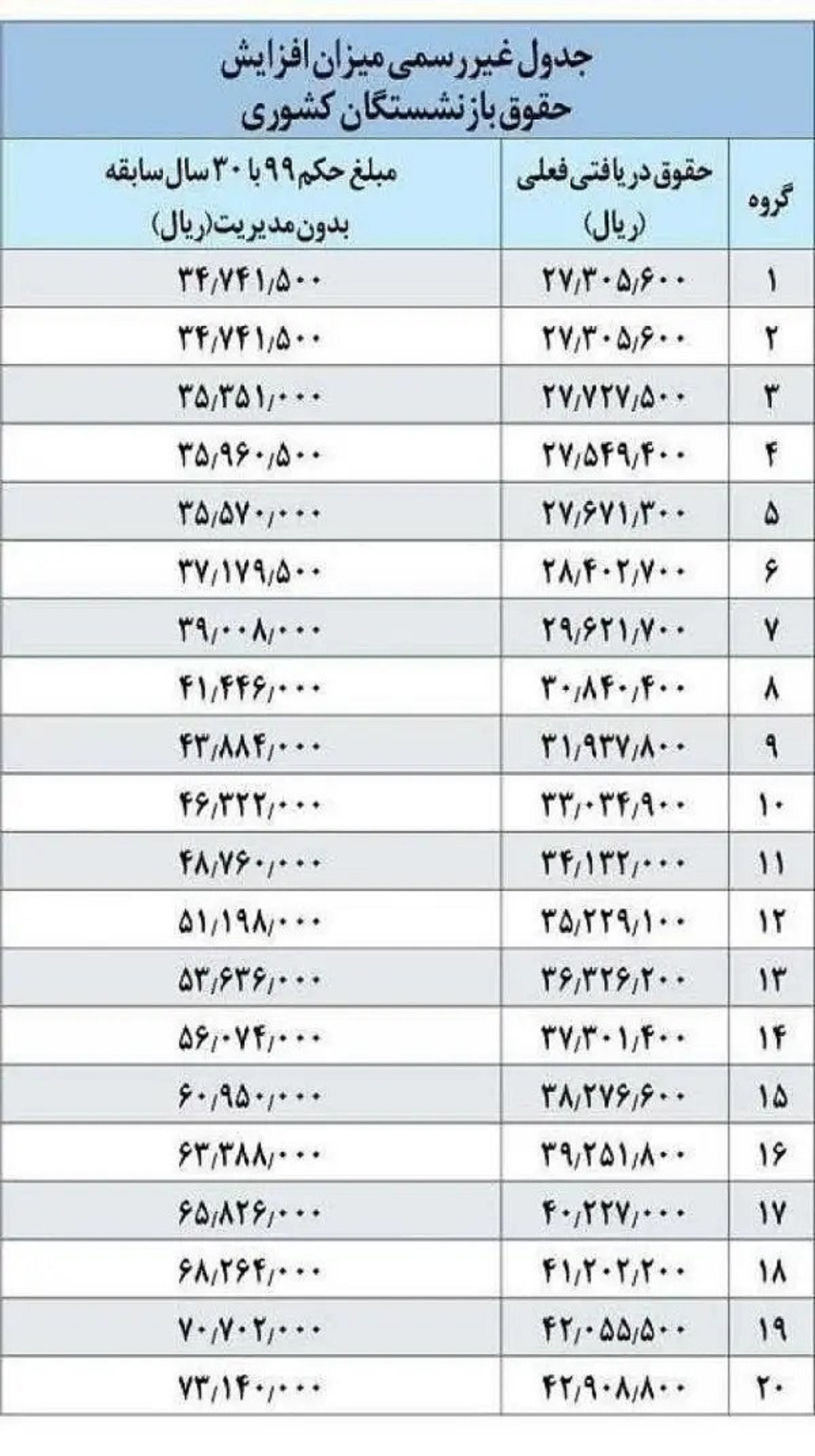 جدول غیررسمی افزایش حقوق بازنشستگان کشوری منتشر شد.