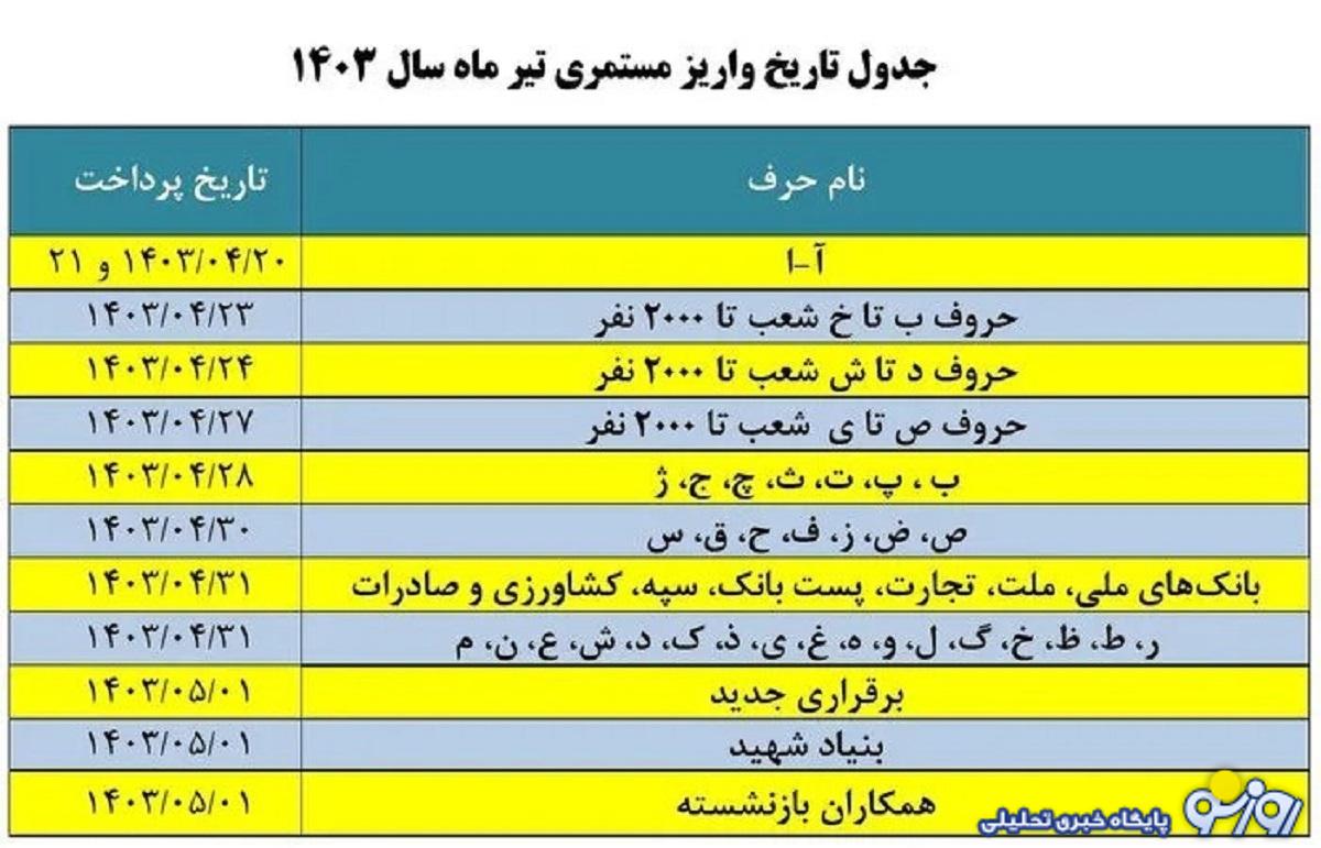 با توجه به همزمانی تاریخ پرداخت حقوق تیرماه بازنشستگان تأمین‌اجتماعی با تعطیلات تاسوعا و عاشورای حسینی(ع)، زمان‌بندی پرداخت حقوق این ماه بازنشستگان، تغییراتی نسبت به ماه‌های قبلی داشته و مطابق جدول زیر است: