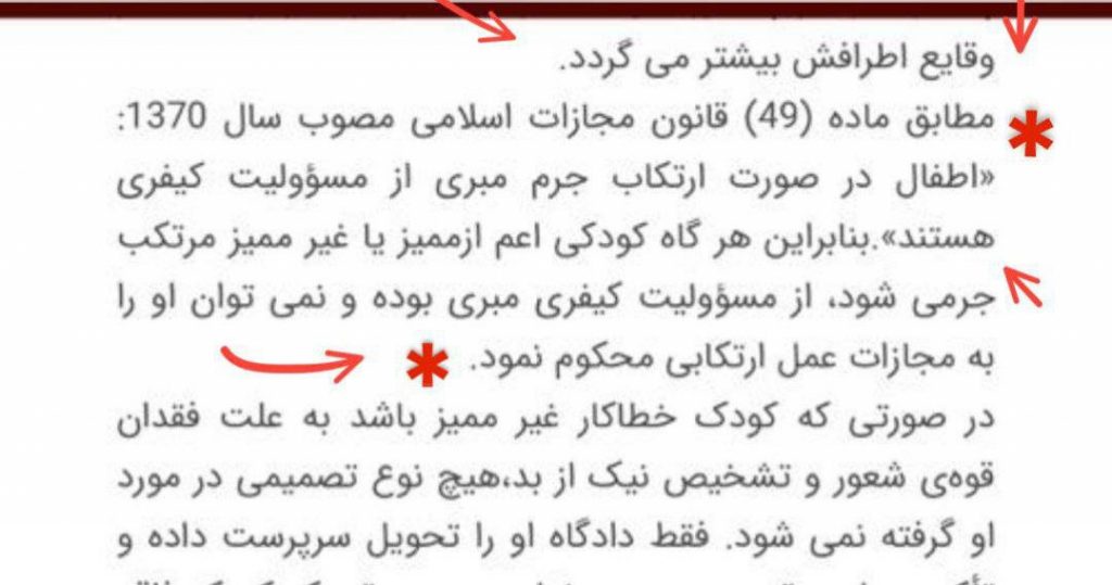 این مادر به سن پایین دخترش اشاره می‌کرد و از برخورد مستقیم قانونی با او گلایه داشت: دختر 14 ساله‌ی من طفل محسوب میشه! اطفال حتی اگر قتلی انجام داده باشند والدشان باید پاسخگو باشد! چند روز قبل انتخابات هم بوده. جوری بچه‌ی من رو می‌زنن که مردم از پنجره‌ها هم واکنش نشون میدن! موبایل کسی که عکس گرفته هم می‌گیرن!