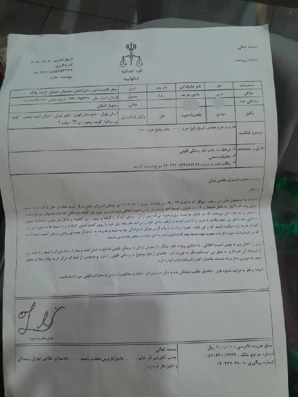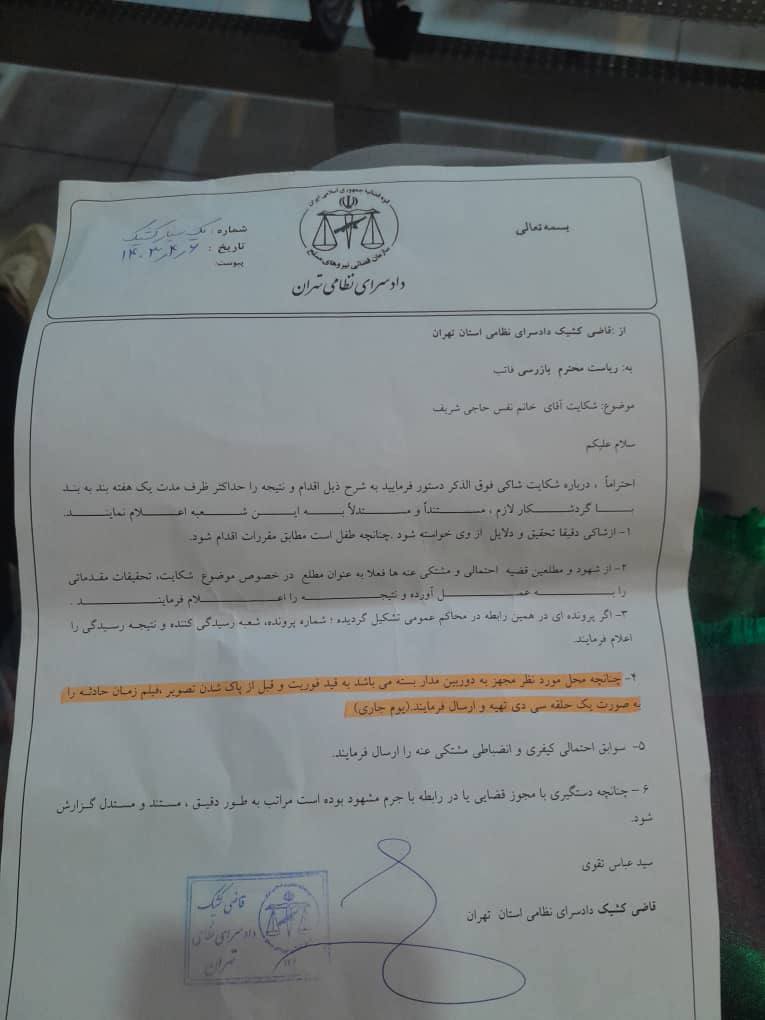 خانم عباسی تصاویری از شکایتش و اجازه‌ی قاضی کشیک برای گرفتن فیلم دوربین مدار بسته و آثار باقی‌مانده‌ی ضرب و شتم بر بدن دخترش را نیز برای ما فرستاده است.