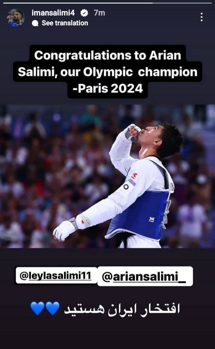 ساعتی پس از کسب مدال طلای وزن ۸۰+ کیلوگرم تیم ملی تکواندو مردان کشورمان توسط آرین سلیمی، ایمان سلیمی مدافع استقلال که حالا مشخص شده آرین پسرعمویش است، با انتشار تصویر او در صفحه شخصی اش این موفقیت بزرگ را به او تبریک گفت.