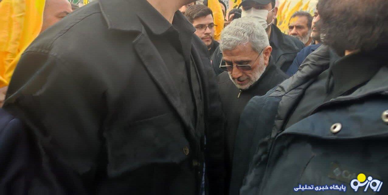 تصویری از حضور سردار اسماعیل قاآنی، فرمانده نیروی قدس سپاه پاسداران انقلاب اسلامی، در مراسم تشییع پیکر شهید سید رضی موسوی در میدان امام حسین (ع) تهران را مشاهده میکنید. سردار سرتیپ سید رضی موسوی عصر روز دوشنبه ۴ دی ماه ۱۴۰۲ در حمله تروریستی رژیم صهیونیستی به منطقه زینبیه دمشق به شهادت رسید و تصویر موجود از سردار قاآنی مربوط به مراسم تشییع شهید رضی در زمستان سال گذشته است.