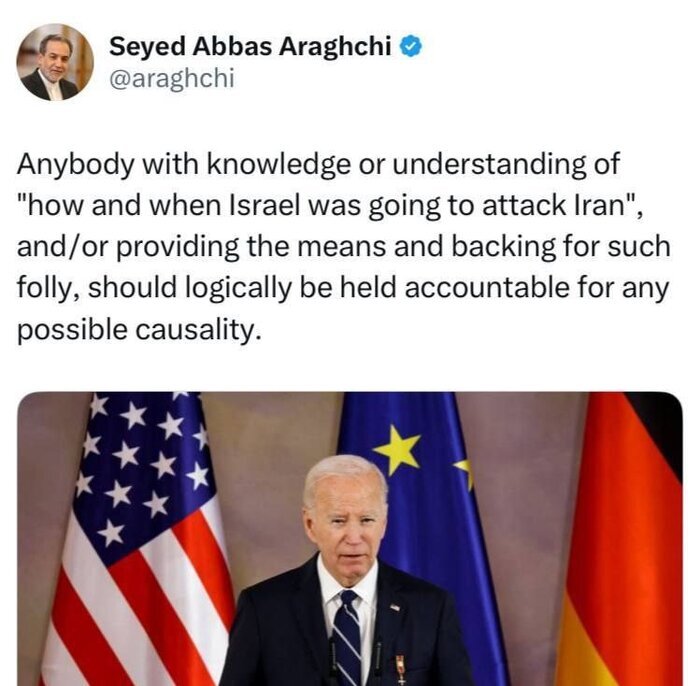 عراقچی در پیامی در شبکه اجتماعی ایکس (توئیتر سابق) با اشاره به مصاحبه اخیر رئیس جمهور آمریکا نوشت: هر که علم و آگاهی از «زمان و چگونگی حمله اسرائیل به ایران» داشته باشد و یا تجهیزات و پشتیبانی برای چنین حماقتی در اختیار قرار داده باشد، منطقا مسئولیت هرگونه خسارت احتمالی را برعهده خواهد داشت.