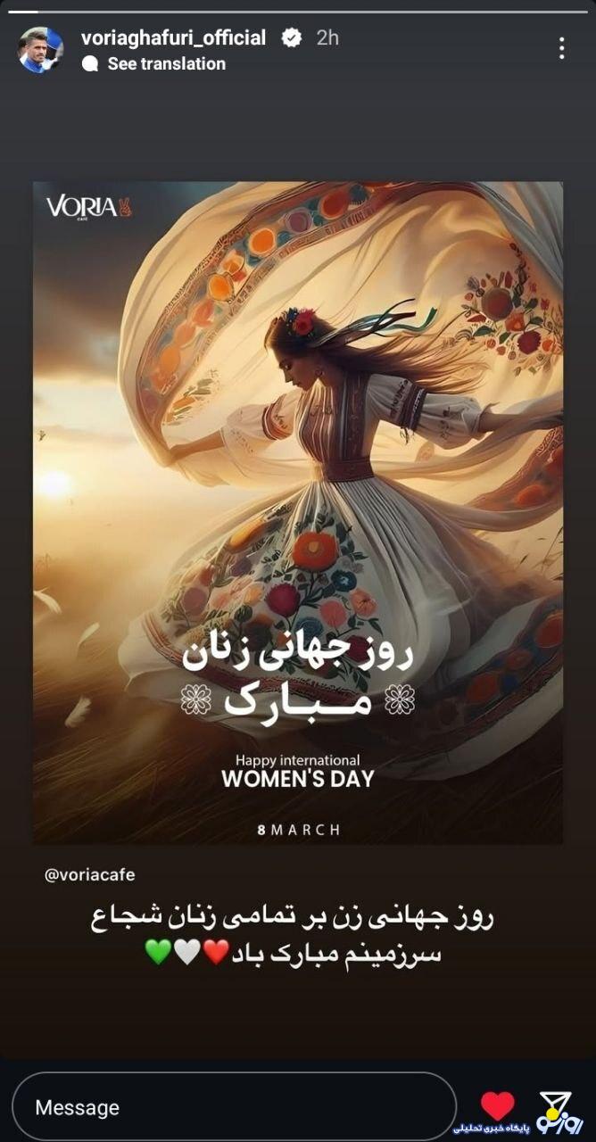 روزنو :امروز ۸ مارس (۱۷ اسفند) روز جهانی زن است. وریا غفوری کاپیتان اسبق استقلال و بازیکن سابق فولاد با انتشار یک استوری اینستاگرامی این روز را به زنان ایرانی تبریک گفت.