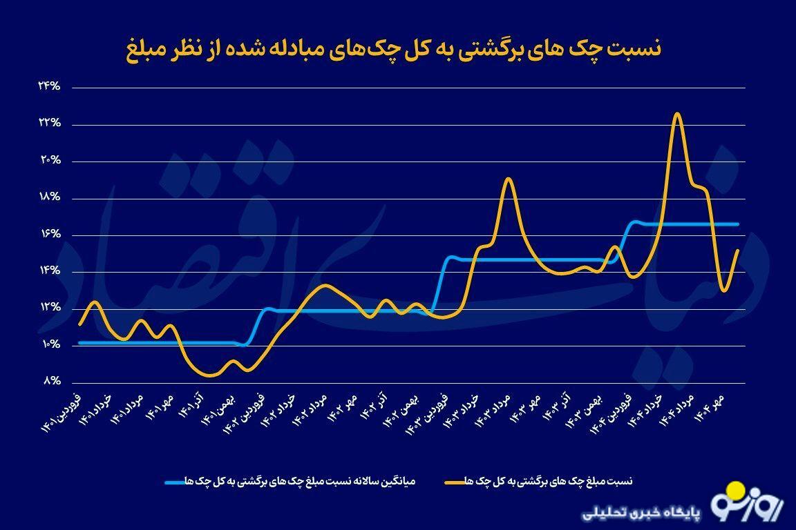 طبق گزارش بانک مرکزی از وضعیت چک‌های مبادله شده، نسبت مبلغ چک‌های برگشتی که تابستان تا ۲۲.۶ درصد رسیده بود، به ۱۵.۲ درصد کاهش یافته است.