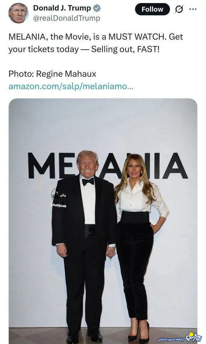 روزنو :در شرایطی که دونالد ترامپ از چند جهت درگیری شدید سیاسی با کشورهای مختلف دارد، توئیتی منتشر کرده و تبلیغ فیلم همسرش ملانیارو کرده و گفته سریع برید بلیط بخرید و فیلمش رو ببینید.