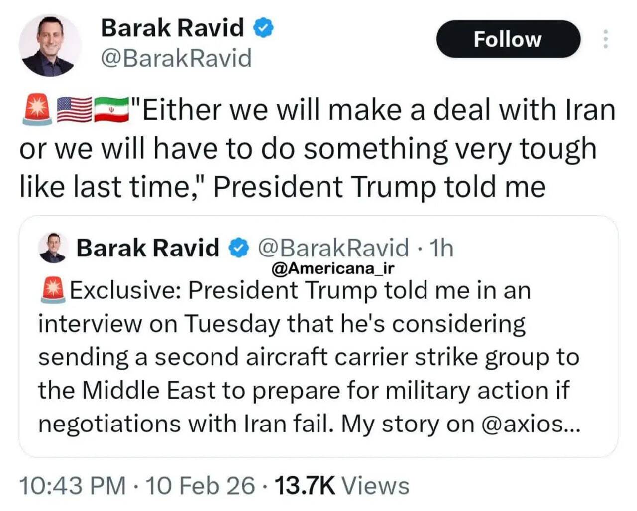 خبرنگار اکسیوس در توییتی اعلام کرد ترامپ به او گفته است: «یا با ایران به توافق میرسیم یا مجبوریم مثل دفعه قبل کار خیلی سختی انجام دهیم.»